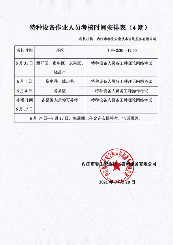 2021年春生公司04期特種設(shè)備作業(yè)人員考核時(shí)間安排