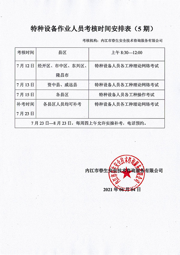 2021年春生公司05期特種設(shè)備作業(yè)人員考核時(shí)間安排
