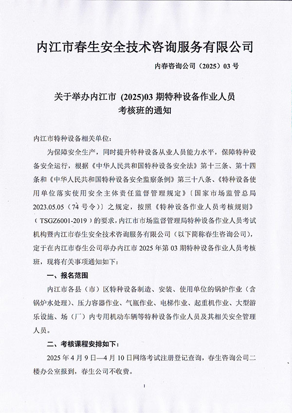 2025年春生公司第3期特種設備作業(yè)人員考核通知